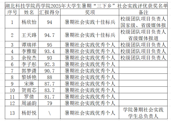 共青团湖北科技学院委员会关于2025年大学生暑期“三下乡”社会实践评优通知,经学生个人申请参与bbin游戏娱乐官网9月4日“青春赴山海,实践绘蓝图”社会实践汇报、学院复审,现将获奖名单奖项予以公示: